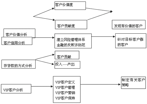 下面是一個以銀行業(yè)為例CRM中BI分析的一個簡單的應(yīng)用方式。