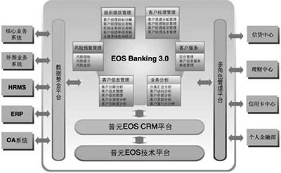 普元公司順應(yīng)中國銀行業(yè)發(fā)展的趨勢,綜合國內(nèi)外金融業(yè)的市場營銷和管理模型,把具有世界級水平的EOS平臺推廣到銀行業(yè),提供具有中國特色的“EOS銀行客戶經(jīng)理管理系統(tǒng)”。這套系統(tǒng)可以幫助銀行快速組織資源,面向客戶提升客戶服務(wù)、市場營銷水平,同時(shí)對客戶經(jīng)理的業(yè)績考核加強(qiáng)管理,為客戶經(jīng)理提供風(fēng)險(xiǎn)控制工具,為營銷主管部門決策提供支持。最終實(shí)現(xiàn)幫助銀行達(dá)到提高利潤、降低成本,提高銀行客戶滿意度及提高市場占有率的管理目標(biāo)。