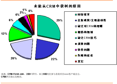 但成功只會(huì)擁抱那些能夠“正確執(zhí)行”的人,而不是任何一個(gè)搭上CRM順風(fēng)船的企業(yè)。2001年7月,CRM-Forum.com出版了一份關(guān)于未能從CRM中獲利原因的報(bào)告。從搜集到的來(lái)自CRM開拓者的約900個(gè)回應(yīng)來(lái)看——客戶端企業(yè),CRM供應(yīng)商以及顧問(wèn),組織變革及企業(yè)政策/主觀能動(dòng)性占了50%以上的失敗原因;緊隨其后的各個(gè)因素包括缺乏對(duì)CRM的理解(20%)和糟糕的規(guī)劃(12%)。下面讓我們就CRM方法論的選擇對(duì)這些因素作一番考察吧。