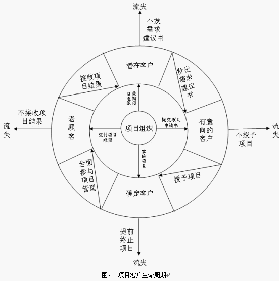 在傳統(tǒng)的項(xiàng)目管理中,項(xiàng)目組織往往不能分清客戶(hù)生命周期,對(duì)不同階段沒(méi)有清楚的認(rèn)識(shí),對(duì)于所采取的措施也不能很好的令客戶(hù)滿(mǎn)意。引起了客戶(hù)與組織之間的溝通障礙,不利于客戶(hù)對(duì)項(xiàng)目的實(shí)時(shí)控制,造成了最終對(duì)項(xiàng)目交付物的不接受或是不滿(mǎn)意。而且,目前我國(guó)的情況還有就是,只重視第三階段客戶(hù)參與項(xiàng)目管理過(guò)程—該階段對(duì)應(yīng)項(xiàng)目生命周期—而忽視對(duì)潛在客戶(hù)的培養(yǎng),與老顧客的關(guān)系建設(shè)等。項(xiàng)目組織應(yīng)該從自身長(zhǎng)遠(yuǎn)利益出發(fā),從提升市場(chǎng)競(jìng)爭(zhēng)力角度出發(fā),通過(guò)實(shí)現(xiàn)客戶(hù)全面滿(mǎn)意贏(yíng)得市場(chǎng)聲譽(yù),從而在激烈的市場(chǎng)競(jìng)爭(zhēng)中立于不敗之地。