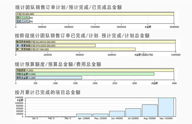 在VamCRM項目組合管理中集成項目數(shù)據(jù)的統(tǒng)計與分析,可以直接監(jiān)控項目計劃、預(yù)計及完成的項目數(shù)量、總金額和費(fèi)用的統(tǒng)計,也可按月累計已完成的項目數(shù)量、總金額和費(fèi)用,直接衡量項目實施的結(jié)果與效益。在費(fèi)用管理模塊中集成費(fèi)用數(shù)據(jù)的統(tǒng)計與分析,對于所有費(fèi)用可以按人及費(fèi)用類型進(jìn)行統(tǒng)計,實時知道哪一個人或哪一類費(fèi)用開銷最多,以及費(fèi)用與預(yù)算的對比分析。