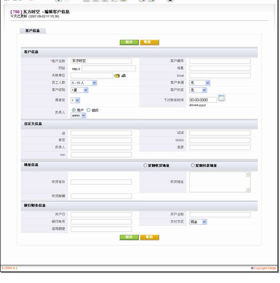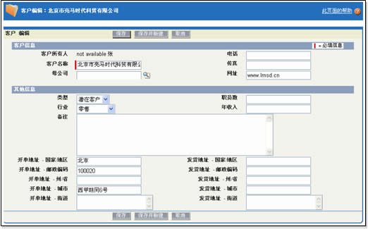 易客采用的窗口切換方式類似于Salesforce,在Ajax大行其道的今天,不能不說這種方式的落后。不過令人欣慰的是,易客在客戶信息被保存后,修改個別字段時大量運(yùn)用了Ajax技術(shù),十分方便。這部分細(xì)節(jié)我們放在維護(hù)客戶部分描述。