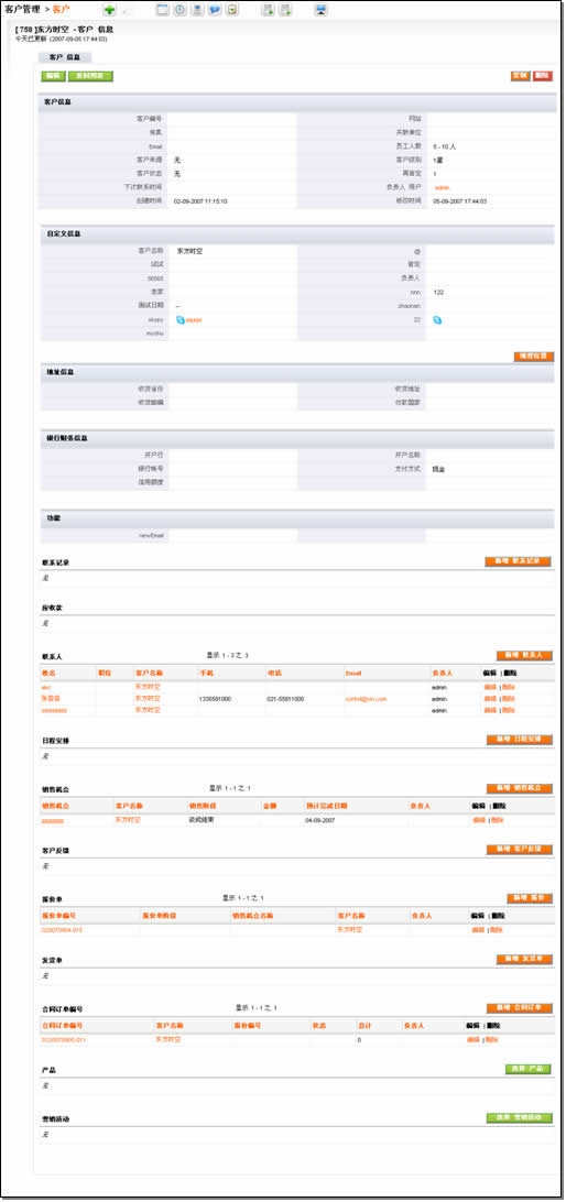 從其視圖的內(nèi)容結(jié)構(gòu)上,分為客戶基本信息、統(tǒng)計(jì)信息、聯(lián)系人;跟蹤;售前(銷售機(jī)會、報(bào)價(jià));售中(合同、訂單、回款發(fā)票);售后(服務(wù)投訴)。應(yīng)該說比較完整地涵蓋了客戶跟蹤和維護(hù)的全部過程。