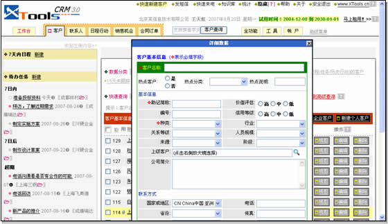 XToolsCRM的快速新建客戶頗有些新意,從操作上看,它突破了關(guān)系型數(shù)據(jù)庫中客戶和聯(lián)系人表分離的制約,同時保存兩表數(shù)據(jù),很方便。