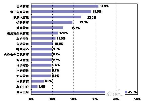 。。調(diào)查顯示,2007年有45.3%的企業(yè)還未應用CRM信息化系統(tǒng)。在已經(jīng)應用該系統(tǒng)的企業(yè)中,CRM系統(tǒng)應用主要就是客戶管理,占到31.9%;其次是客戶信息管理和聯(lián)系人管理,這些應用比例集中在23~31%之間;其他應用還有銷售管理(19.5%)、時間管理(15.1%)、供應商關系管理(12.8%)、客戶服務(11.5%)和營銷管理(10.5%)等,呼叫中心、合作伙伴關系管理、商業(yè)智能、電子商務、電話銷售、知識管理、電話營銷等比例均在10%以下。