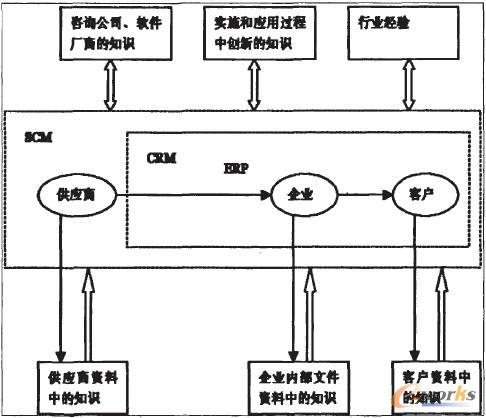 供應鏈上的各個企業(yè)在各自ERP系流運行的基礎上,與客戶之間用CRM系統(tǒng)聯(lián)結(jié)起來,而整個供應鏈上的所有企業(yè)都在SCM系統(tǒng)框架之內(nèi)。三者整合過程中,供應鏈上各個企業(yè)(包括上游企業(yè)即供應商,下游企業(yè)即客戶)資料中的知識由各個企業(yè)傳遞到CRM信息管理平臺之上。而咨詢公司與軟件廠商的知識、實施和應用過程中創(chuàng)新的知識以及行業(yè)經(jīng)驗等知識則需要在整合過程中在各個企業(yè)湖軟件廠商之間相互交流、磨合,最后提出大家都比較滿意的方案,付諸實拖。