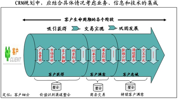 在客戶生命周期的全過程中,企業(yè)通過高效、有序的管理手段和信息技術,識別、吸引獲得、交易實現、鞏固發(fā)展客戶,與其保持終身的互動關系,并有計劃地滿足其需求。整個過程中有一橫N縱,一橫就是客戶生命周期線,N縱就是企業(yè)與客戶生命周期線的每個直接或間接接觸點。通過這一橫N縱,打造以客戶為中心的360度客戶服務。有的接觸點貫穿客戶整個生命周期。