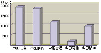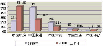 通過引入IP電話業(yè)務(wù),我國電信市場(chǎng)已經(jīng)形成了以中國電信、中國聯(lián)通、中國移動(dòng)、中國吉通和中國網(wǎng)通等五大電信運(yùn)營公司為主體的新格局。他們各自的業(yè)務(wù)范圍不盡相同,但I(xiàn)P電話是他們相同的業(yè)務(wù)之一,所以這一市場(chǎng)相互之間的競爭較為激烈。圖1和圖2分別表示這五大運(yùn)營商在2000年上半年IP電話的話務(wù)量和收入。從圖中可以看出,他們?cè)谖覈鳬P電話市場(chǎng)上所占據(jù)的地位和角色。