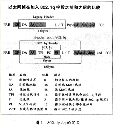 這種解決方案是根據(jù)對IEEE 802.1p/q協(xié)議字段的處理來區(qū)分不同優(yōu)先級業(yè)務(wù)的。IEEE 802.1p/q同屬于一個子集,它在傳統(tǒng)的以太網(wǎng)幀頭中加入了4個字節(jié),其中802.1p占3位。802.1p延伸了802.1d的協(xié)議,利用3位優(yōu)先級位可以最多提供8個優(yōu)先等級。而802.1q利用VI(VLAN Identifier,虛擬網(wǎng)標識)位識別傳送的幀究竟屬于哪一個虛網(wǎng)。VI位共有12位,最大可以支持的虛網(wǎng)個數(shù)不會超過4096個。 802.1p/q的具體定義可以參見圖1。