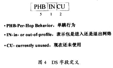Diff-Serv比Int-Serv 更具可擴展性,如圖3所示,它可用于企業(yè)的廣域網(wǎng)中,并在運營商網(wǎng)絡(luò)中發(fā)揮重要的作用,因為它可以根據(jù)應(yīng)用或業(yè)務(wù)類型排出不同的優(yōu)先級別。業(yè)務(wù)區(qū)分結(jié)構(gòu)使用IPv4報頭中的業(yè)務(wù)類型(ToS)字段,并將8 位ToS字段重新命名,作為DS字段,其中6位可供目前使用,剩余2位以備將來使用,如圖4所示。通過該字段的標記,下行節(jié)點可以獲取足夠的服務(wù)質(zhì)量信息,以對到達該端口的數(shù)據(jù)包做出相應(yīng)的“處理”,將它們正確地轉(zhuǎn)發(fā)給下一跳的路由器。這里需要注意, ToS字段和DS字段的定義是不同的。邊緣路由器可以將ToS字段映射到DS字段。