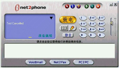 。ㄈ鐖D2),這是 Net2phone的界面,整個(gè)結(jié)構(gòu)一目了然,注意最下面的幾個(gè)按鈕:“voiceemail(語(yǔ)音郵件),net2fax(網(wǎng)絡(luò)傳真),pc2pc(計(jì)算機(jī)之間的通信)”, 這些就是 Net2phone的主要功能了,在上面一行的那個(gè)畫(huà)有鼠標(biāo)指針的按鈕是主菜單,里面有軟件最主要的設(shè)置項(xiàng)。