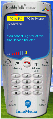 。ㄈ鐖D3),這個就是BuddyTalk的軟件界面。這象不象一個手機?上面的藍色部分是液晶屏。你可以選擇pc-to-pc或者pc-to-phone,下面是用來輸入電話號碼的一個空框,空框下面的部分是軟件顯示提示信息的,再下面是音量大小的顯示器。液晶屏的下面部分跟手機幾乎一樣,其中一個“search”,這是用來上網(wǎng)實現(xiàn)全球用戶數(shù)據(jù)庫搜索,一個“options”,各種設置可以在這里完成,“Memory”記錄的是你通話信息,以利快速撥號。