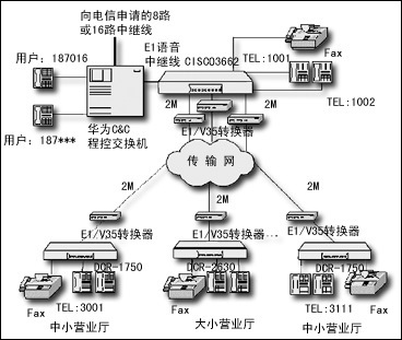 市聯(lián)通通過在Cisco 3662路由器上配置一個NM-HDV-1E1-30E語音中繼模塊,通過75歐姆同軸電纜與華為程控交換機(jī)的E1接口板相連,提供30路話音,該路由器用作語音網(wǎng)關(guān)。各網(wǎng)點配置神州數(shù)碼路由器,配置MR-VIC-2FXS或MR-NM-4FXS語音模塊,提供多路語音。
