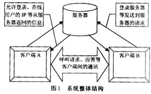 通過設置一個信令服務器的方式綜合以上兩種方式的優(yōu)缺點。用戶通話程序工作于半客戶機狀態(tài),信令服務器負責客戶的集中呼叫。當某一個客戶呼叫,服務器負責中轉呼叫,當被叫客戶響應呼叫并應答后,自主于呼叫方進行通話而不必經過信令服務器,這樣,大幅度地減少了服務器的數據量。有了集中的信令服務器,也便于客戶的管理,還可進行廣播消息的發(fā)布。