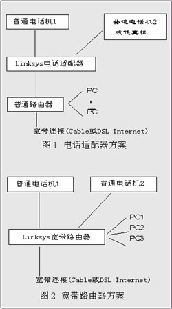 利用電話適配器和寬帶路由器實現(xiàn)VoIP服務(wù)提供以及與PC的連接,分別如圖1和圖2所示。