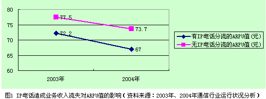 IP電話使ARPU值降低。2003年和2004年全國電信業(yè)務(wù)收入及電話用戶總數(shù)分別為4610億元、53199.8萬戶和5205億元、64726.7萬戶,平均ARPU值2003年為72.2元,2004年為67元。通過分析計算,由于IP電話造成的業(yè)務(wù)收入流失使2003年的平均ARPU值降低了5.3元,