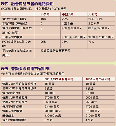 據(jù)研究顯示,當公司融合它們的網(wǎng)絡(luò)后,將電信費用減少了25%到60%。(見表四)這筆費用包括每分鐘長途、本地環(huán)路、普通電話服務(wù)(POTS)線路和音頻/視頻服務(wù)。
