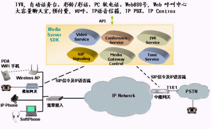 該公司的IP媒體服務(wù)器 (IP Media Server SDK)是一個(gè)具有IP多媒體處理能力和SIP呼叫功能的開(kāi)放平臺(tái)。它主要提供給各增值業(yè)務(wù)開(kāi)發(fā)商、軟交換廠商、軟件開(kāi)發(fā)商以及具有開(kāi)發(fā)能力的系統(tǒng)集成商;谠撈脚_(tái),這些廠商可以迅速地、低成本地開(kāi)發(fā)出各種各樣的基于IP的增值業(yè)務(wù)如下圖所示: