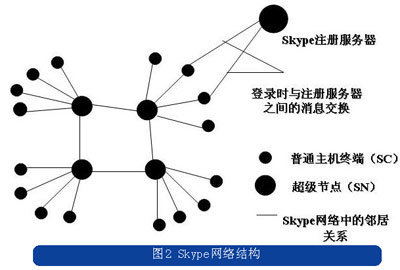 與常規(guī)的電信業(yè)務(wù)網(wǎng)絡(luò)不同的是,Skype的網(wǎng)絡(luò)中除了注冊服務(wù)器,沒有其他任何集中的服務(wù)器,只是將用戶節(jié)點分為普通節(jié)點和超級節(jié)點。Skype的系統(tǒng)連接結(jié)構(gòu)如圖2所示。