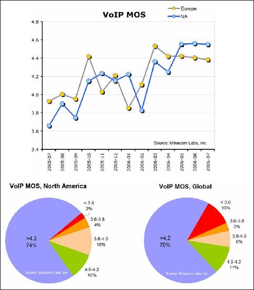 Minacom最新調(diào)研表明,一年來VoIP電話質(zhì)量和聯(lián)結(jié)速度都超過傳統(tǒng)標(biāo)準(zhǔn)公共開關(guān)電話。電話質(zhì)量得分Mean Opinion Score (MOS)數(shù)據(jù)表明,VoIP得分是4.2,而標(biāo)準(zhǔn)公共開關(guān)電話得分3.9。85%的IP電話質(zhì)量和穩(wěn)定性都超過標(biāo)準(zhǔn)公共開關(guān)電話。對(duì)電話聯(lián)結(jié)速度,VoIP的MOS得分是平均8.2秒,傳統(tǒng)電話時(shí)間更長(zhǎng),平均為8.9秒。這里的IP電話服務(wù)指商業(yè)企業(yè)級(jí)應(yīng)用,不是MSN,雅虎通之類免費(fèi)IP電話個(gè)人應(yīng)用。比較而言,北美IP電話質(zhì)量?jī)?yōu)于歐洲。