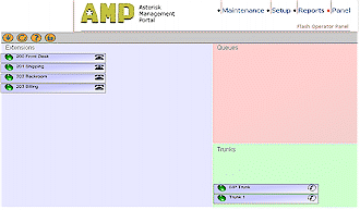 面板標(biāo)簽(圖8)是一個(gè)由Flash建立的操作面板,它包含有不同的extensions、隊(duì)列和中斷,并可允許你來查看誰在使用這個(gè)系統(tǒng),還可轉(zhuǎn)移呼叫、掛斷線路并可通過面板來建立電話會(huì)議。