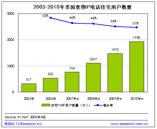 iResearch艾瑞市場咨詢根據(jù)In-Stat的調查數(shù)據(jù)整理發(fā)現(xiàn),2005年美國住宅VoIP用戶數(shù)量為317萬,到今年年底這一數(shù)字將達到523萬,比上年增長65%.隨著寬帶互聯(lián)網接入的持續(xù)普及,據(jù)預測到2007年將有764萬美國家庭使用寬帶接入的IP電話。