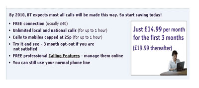 BTBroadbandTalk產品在其套餐使用費中包括了一定時段的免費國內時長,國際長途按照通話量另外收取。VoIP通話所需要的寬帶電話設備由BT免費提供給客戶。
