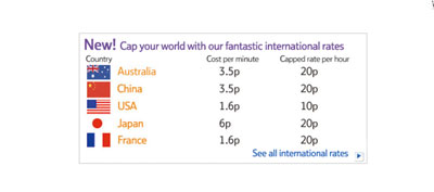 套餐2(BusinessBroadbandVoiceLine Olny):免費接入(通常需要40英鎊),每月5英鎊,本地及國內通話資費3.5便士/分鐘,第一個小時通話資費10便士封頂;撥打手機通話優(yōu)惠,1小時通話資費封頂25便士;國際通話優(yōu)惠,不同流向國家的1小時通話資費封頂10或20便士,如圖3所示。