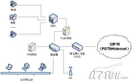IP-PBX或者分組語音交換(PVX),以及綜合接入設(shè)備(IAD),從而取代傳統(tǒng)的PBX和終端。IAD通常支持基于DSL的業(yè)務(wù),因此部署時不需要多個物理線路的開銷,因?yàn)橐粭l來自IAD的物理線路能夠支持多個虛擬電路。PVX可以處理各種分組話音服務(wù),而且可以避免升級和互操作性的問題。