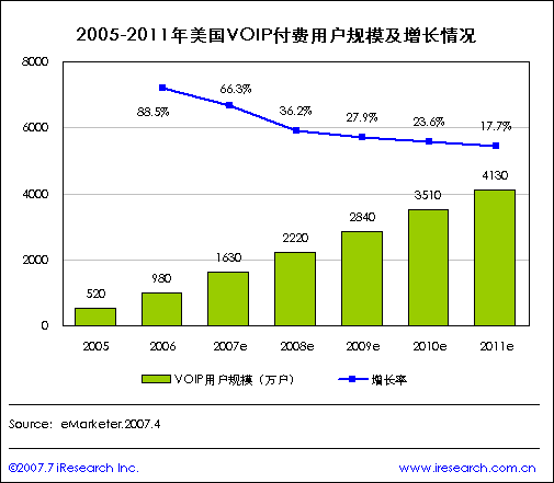 2011年美國(guó)VOIP付費(fèi)用戶規(guī)模將達(dá)4130萬(wàn)戶
