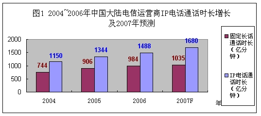 圖1:2004-2006年中國大陸電信運營商IP電話通話時長增長及2007-2008年預測。