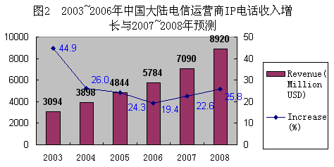 圖2:2003-2006年中國大陸電信運營商IP電話收入增長及2007-2008年預測。