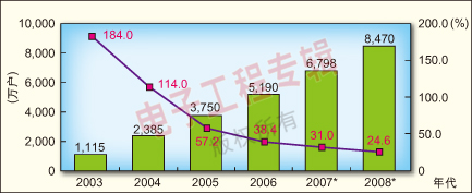 圖3:2003-2006年中國大陸寬帶用戶數(shù)量增長及2007-2008年預測。