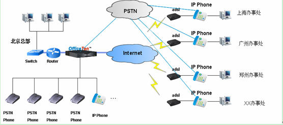 在企業(yè)總部部署一臺OfficeTen,利用OfficeTen的軟交換功能實(shí)現(xiàn)企業(yè)內(nèi)部IP網(wǎng)絡(luò)放號、IP Phone的注冊管理和寬帶網(wǎng)絡(luò)的接入,并可實(shí)現(xiàn)總部分機(jī)同時具有外線號碼功能。OfficeTen通過多路FXO口接入PSTN網(wǎng)絡(luò),通過Ethernet口接入Internet,實(shí)現(xiàn)語音和數(shù)據(jù)的綜合接入;對內(nèi)通過Ethernet口連接內(nèi)部Router和Switch,通過FXS口接入模擬PSTN