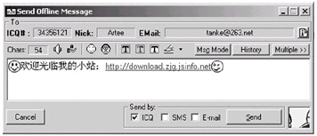 熱線聯(lián)系 即使ICQ界面最小化,一個(gè)顯示選中好友昵稱的小按鈕依然會保持在所有窗口的最前端,雙擊它馬上就可以給朋友發(fā)消息了。