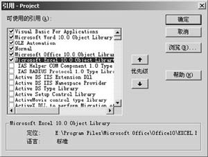 打開VBA編輯器,從工具選單中選擇引用命令,選定Microsoft Excel 10.0對(duì)象庫并確定(見圖2)。