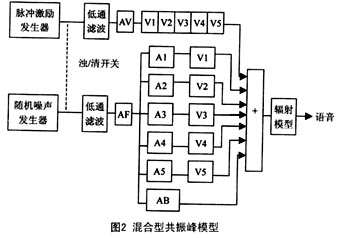----混 合 型 共 振 峰 模 型 在 級(jí) 聯(lián) 型 共 振 峰 合 成 模 型 中, 共 振 峰 濾 波 器 首 尾 相 接; 而 在 并 聯(lián) 型 模 型 中, 輸 入 信 號(hào) 先 分 別 通 過 幅 度 調(diào) 節(jié) 再 加 到 每 一 個(gè) 共 振 峰 濾 波 器 上, 然 后 將 各 路 的 輸 出 疊 加 起 來。 將 兩 者 比 較, 對 于 合 成 聲 源 位 于 聲 道 末 端 的 語 音( 大 多 數(shù) 的 元 音), 級(jí) 聯(lián) 型 合 乎 語 音 產(chǎn) 生 的 聲 學(xué) 理 論, 并 且 無 需 為 每 一 個(gè) 濾 波 器 分 設(shè) 幅 度 調(diào) 節(jié); 而 對 于 合 成 聲 源 位 于 聲 道 中 間 的 語 音( 大 多 數(shù) 清 擦 音 和 塞 音), 并 聯(lián) 型 則 比 較 合 適, 但 是 其 幅 度 調(diào) 節(jié) 很 復(fù) 雜。 基 于 此 種 考 慮, 人 們 將 兩 者 結(jié) 合 在 一 起, 提 出 了 混 和 型 共 振 峰 模 型, 如 圖2 所 示。