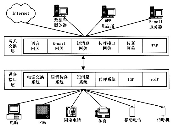 統(tǒng)一消息平臺集成了固定電話網(wǎng)、移動電話網(wǎng)和Internet網(wǎng)絡。目前,電話網(wǎng)和Internet網(wǎng)各自擁有獨立的網(wǎng)絡資源和信息服務領域,而這兩大網(wǎng)絡的用戶群存在著很大的交叉。電話的使用在中國已經(jīng)占有很高的普及率,傳統(tǒng)的160/168聲訊服務已經(jīng)成為中國百姓所熟悉的最具代表性的電話信息服務,而Internet作為在中國剛剛興起的信息媒體,尚需要普通百姓逐漸認識它、使用它。統(tǒng)一消息平臺將電話網(wǎng)和Internet網(wǎng)結合在一起,極大地擴大了兩大網(wǎng)絡各自的用戶群,電話用戶可以用電話或者傳真獲取Internet上的信息,電子郵件服務也可以不局限于Internet,而能對廣大的電話用戶開放。統(tǒng)一消息平臺為用戶帶來的是信息的方便、及時,使人們在任何時間、任何地點都能夠獲取需要的信息。