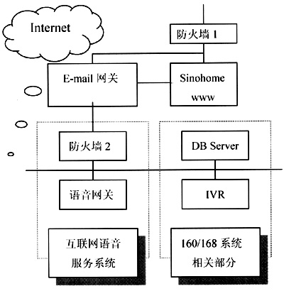 160/168聲訊平臺通過炎黃新星的網(wǎng)關產(chǎn)品與Internet相聯(lián),為了保證原有聲訊系統(tǒng)的安全性,在炎黃新星多終端信息訪問平臺的網(wǎng)絡結構中增加了防火墻設置,原有的160/168聲訊平臺置于防火墻的后端,只與炎黃新星的語音合成網(wǎng)關存在通信聯(lián)系。
