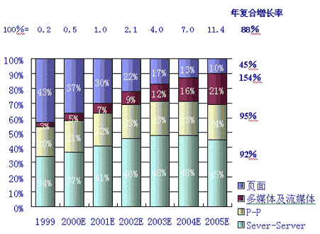 同時,人們對P-P的互動及多媒體的傳輸?shù)男枨髮⒊蔀榫W(wǎng)絡(luò)使用的2個最主要的發(fā)展趨勢。據(jù)麥肯錫公司和JP摩根的分析和預(yù)測,多媒體及流媒體的IP流量將以每年154%的復(fù)合率增長,而P-P的IP流量將以95%的年復(fù)合增長率增長,這2項將成為用戶需求增長最快的業(yè)務(wù)。如下圖,