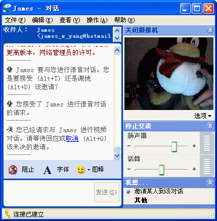 單擊對話框右邊的“啟動攝像機”和“開始交談”,系統(tǒng)會提示你正在等待對方回應視頻或語音對話的邀請,對方接受,就開始進行視頻通話(見圖11)。如果雙方都有攝像頭,你還可以通過視頻框下面的“選項”將自己的影像設為畫中畫的功能。