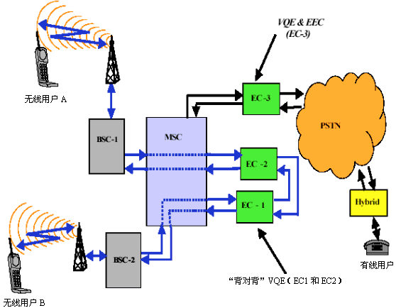 GSM實(shí)施了A-Interface(空中接口)體系結(jié)構(gòu)。在圖1中,給出了部署A-Interface戰(zhàn)略的通用GSM網(wǎng)絡(luò)配置。如圖所示,這種拓?fù)浞桨冈贏-Interface上采用了VQE(EC-1和EC-2)功能,在PSTN接口處僅采用了EEC(EC-3)功能。這種方案給出了一種技術(shù)出眾的格局。EC-3組件消除了源自"PSTN到移動(dòng)"呼叫所致的電氣(混合)回聲,而EC-1和EC-2部件則在每一次的"移動(dòng)對(duì)移動(dòng)"以及"移動(dòng)到PSTN"呼叫上提供了VQE(語(yǔ)音質(zhì)量增強(qiáng))功能。