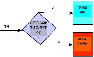 聲學(xué)回聲的一般頻譜特征類似于語(yǔ)音的頻譜特征。類似地,聲學(xué)回聲路徑中的非線性特征會(huì)引起回聲和原始語(yǔ)音音節(jié)之間的不一致。因此,有效語(yǔ)音和對(duì)應(yīng)的聲學(xué)回聲之間的電平差異(振幅差異)提供了相應(yīng)的信息,使用該類信息,可將聲學(xué)回聲從主流語(yǔ)音中分離出來(lái)。在圖4中,給出了識(shí)別某一信號(hào)是有效信號(hào)還是聲學(xué)回聲信號(hào)所采用的邏輯方法的概念視圖。