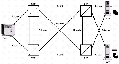 SS7提供消息傳遞以實現(xiàn)正確無誤的業(yè)務(wù)功能,如呼叫建立。因此,SS7被設(shè)計成能達到相當(dāng)高的可靠性。可靠性來自鏈路的多樣性和冗余備份。圖4說明了一個簡單SS7網(wǎng)絡(luò)的標(biāo)準(zhǔn)例子,著重說明了一些內(nèi)建的可靠性特征,比如鏈路的網(wǎng)狀配置,這樣使得網(wǎng)絡(luò)中的每個信令點間都有冗余備份的鏈路,從而提高了整個網(wǎng)絡(luò)的可靠性。