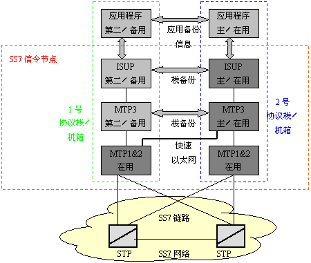 只有SS7鏈路出現(xiàn)故障時,SS7協(xié)議才有相應(yīng)的規(guī)則去處理故障,對其它故障的處理必須在設(shè)計SS7平臺和整個系統(tǒng)結(jié)構(gòu)時予以考慮。還有一個普遍的要求是:軟件的升級過程中不能影響整個系統(tǒng)的運行。能達到以上要求的一個解決方案是:使用兩個主機箱,在每個主機箱里插有SS7接口板,用于支持一條或多條SS7鏈路。讓兩個主機都使用一個SS7地址,也就是共用一個信令點編碼,這樣遠(yuǎn)端的交換機或STP就會認(rèn)為這兩個主機是一個完整的系統(tǒng)。這樣,這兩個主機組成的系統(tǒng)就能在其中一個出現(xiàn)故障時仍能正常工作。
