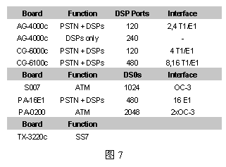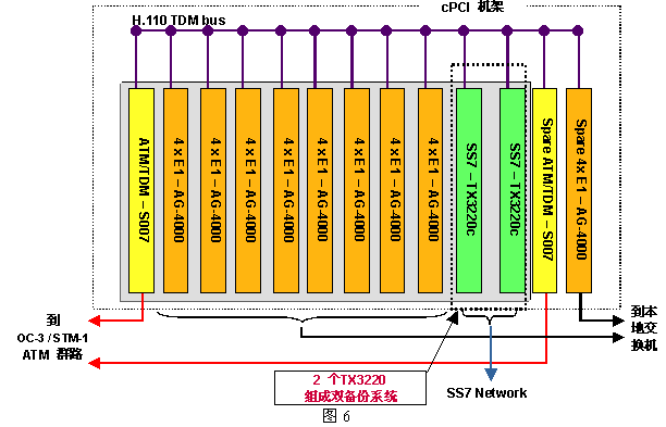 為具體起見,圖6給出一個960話音端口的應(yīng)用方案,其中用到了三種NMS公司的設(shè)備:AG-4000c、S007和TX-3220c,圖中未列出用來運(yùn)行應(yīng)用程序的CPU板(AG4000系列板卡不含CPU,而AG600eC包含了CPU)。