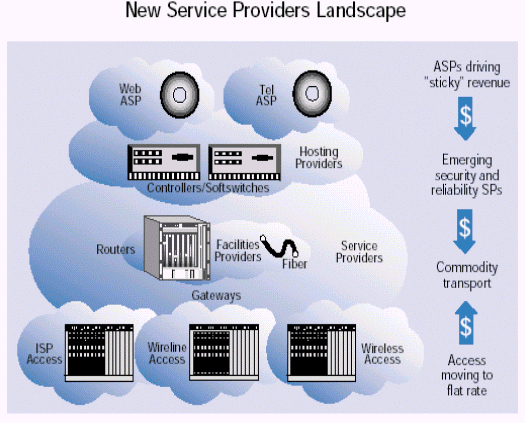 長(zhǎng)距離時(shí)間日漸商品化。業(yè)務(wù)提供商不斷地尋求更高價(jià)值的,與眾不同的業(yè)務(wù)來(lái)幫助他們提高消費(fèi)者的滿意度和吸引新的客戶。新一代的業(yè)務(wù)提供商會(huì)在帶寬上依賴于第三方的運(yùn)營(yíng)商,在Internet和語(yǔ)音服務(wù)器的基礎(chǔ)設(shè)施上依賴于托管業(yè)務(wù)提供商。而他們自己的精力將會(huì)主要放在建立一個(gè)本地接入上