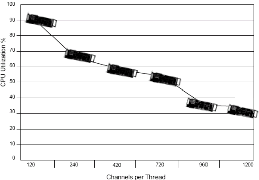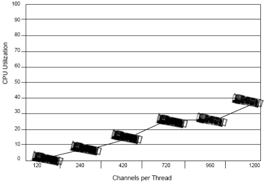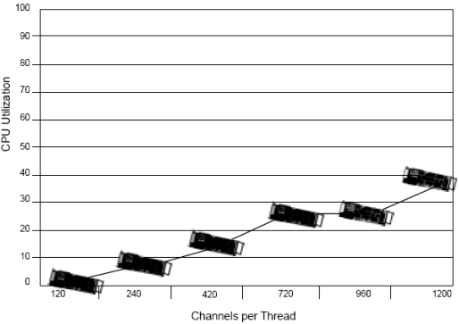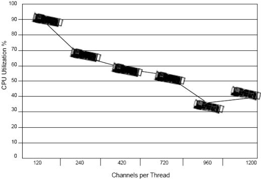 基于1200通道, Dialogic工程師測試了每個(gè)線程不同的通道數(shù)(例如每個(gè)線程120端口和240端口). 測試結(jié)果表明,