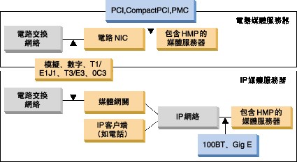 部署架構 模塊化的下一代網絡將語音和數據合并在單個包基礎結構中。這使目前的兩種主要架構可用于部署媒體服務;基于直通電路的網絡接口和基于包的IP網絡接口。下面的圖說明了這兩種架構。Dialogic
