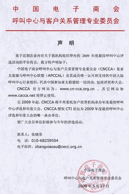 鄭重聲明: CNCCA授權(quán)CTI論壇為2009年度中國(亞太)最佳呼叫中心評(píng)選和年度大會(huì)的唯一承辦單位。